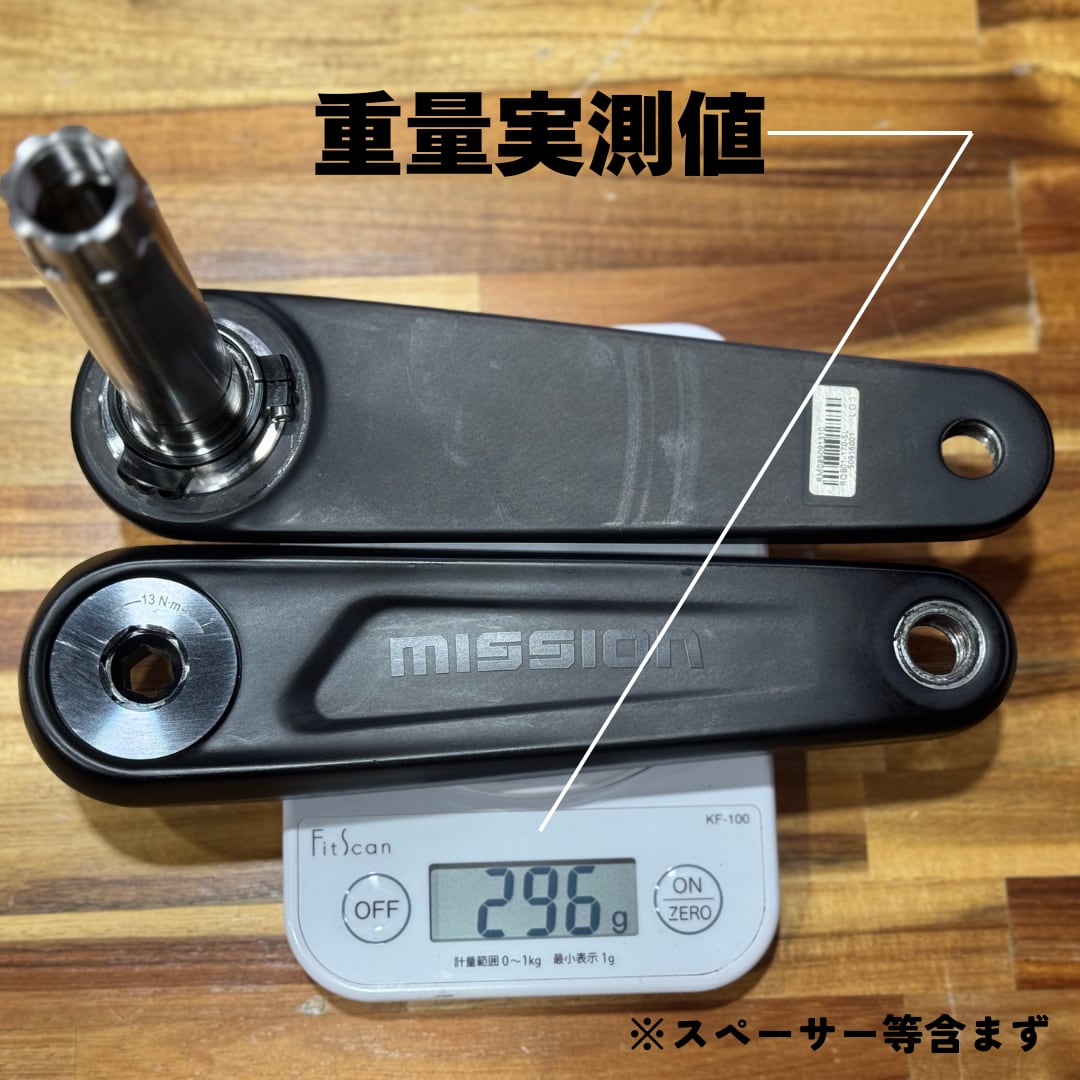 クランク(シャフト込み)の重量は 295g(±10g)。※スペーサー含まず